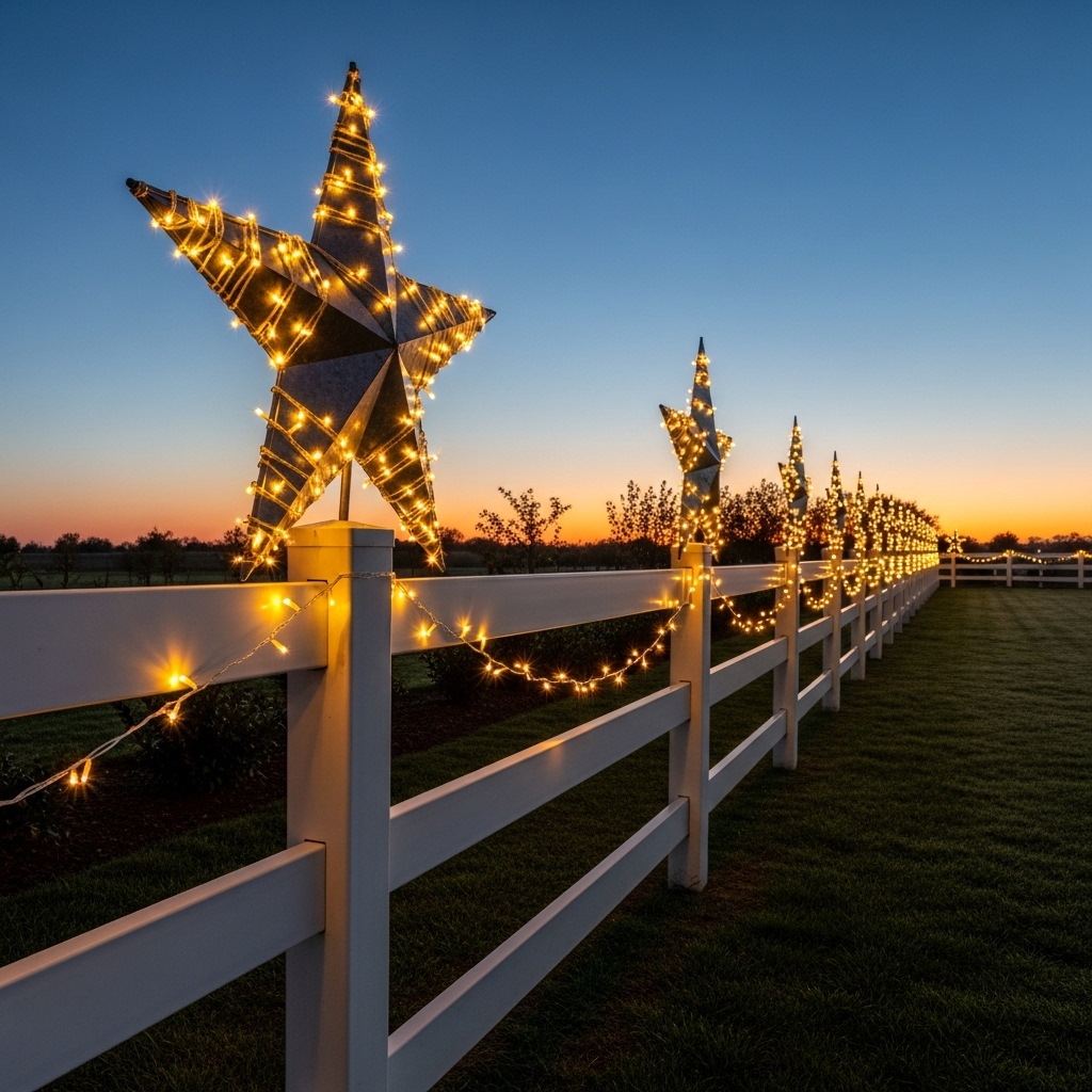 Define your space with celestial patterns along your fence. Create or purchase star forms to wrap with lights, spacing them evenly. Fill between with simple twinkle lights. This charming outdoor Christmas lights idea adds personality to plain fencing and creates a beautiful boundary that feels festive rather than restrictive.