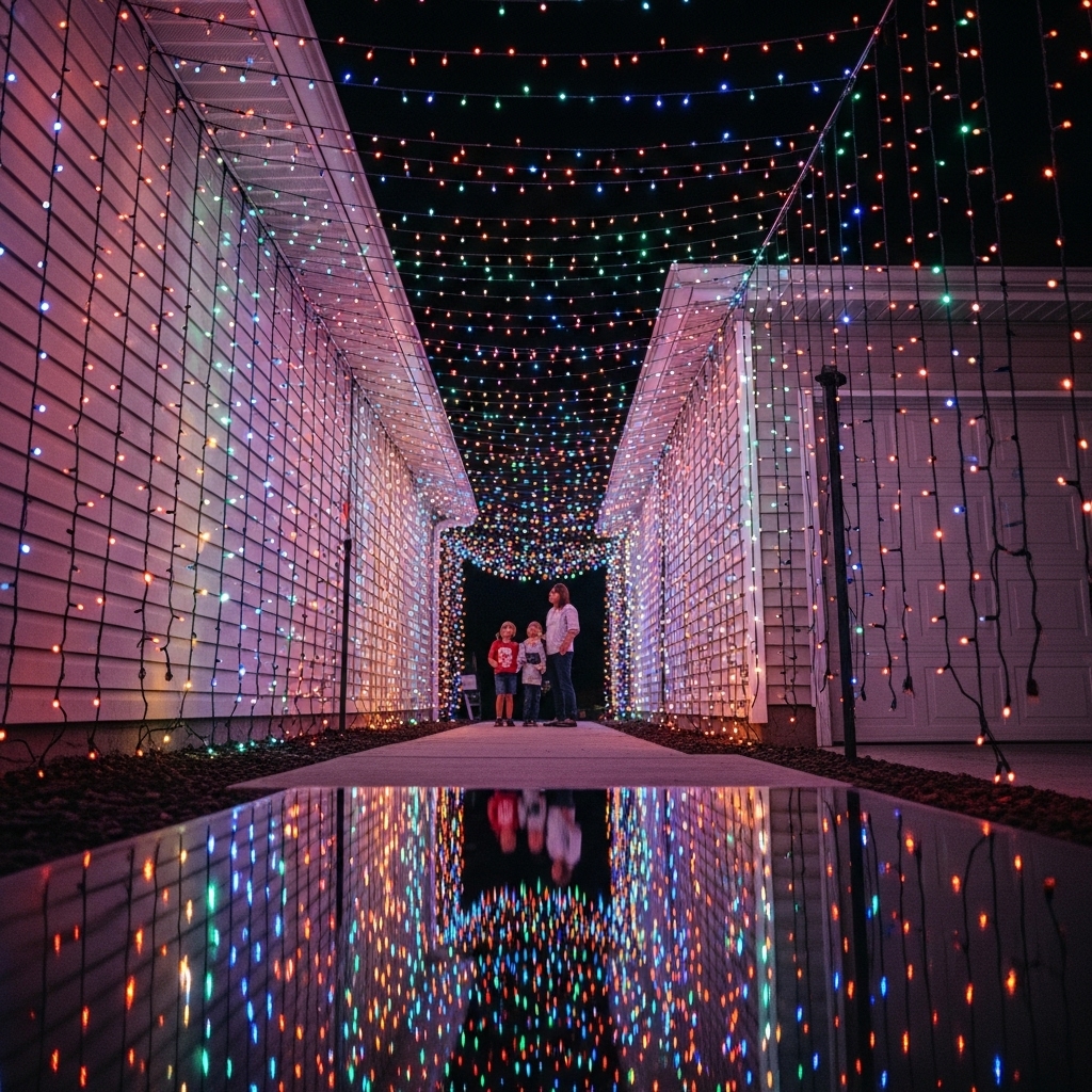 Create an unforgettable experience with a light tunnel. Use an existing passageway or create one with temporary posts. Hang lights densely from above to surround visitors completely. This immersive outdoor Christmas lights installation becomes a destination in itself, encouraging guests to walk through and be fully enveloped in holiday magic.