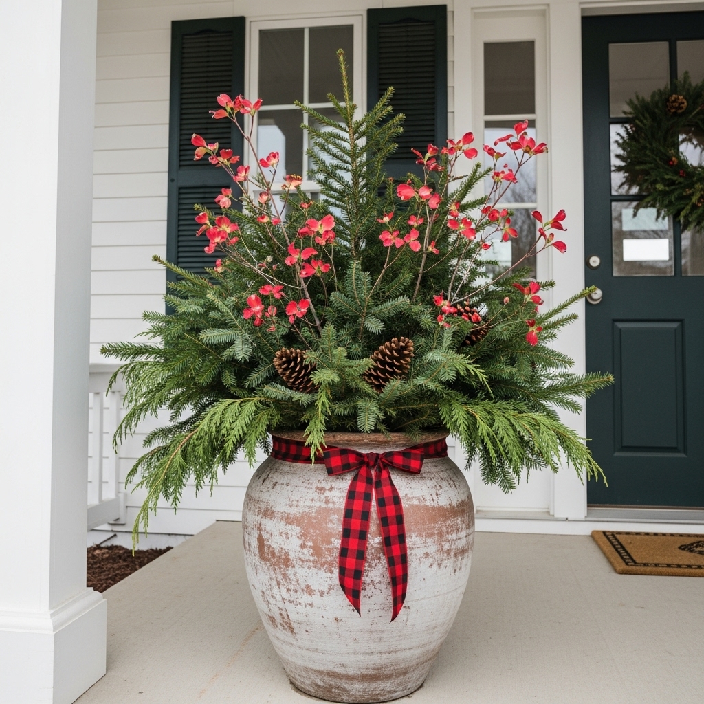 Welcome guests with a simple and stunning porch pot. Fill a large, rustic container with cuttings from your garden or local tree lot. Use a variety of evergreens for texture. Add height with red twig dogwood branches for a festive color contrast. This rustic Christmas decor idea is easy to assemble and makes a big impact. It’s a cost-effective way to bring holiday cheer to your entryway. The fresh greenery will last throughout the season, filling the air with a wonderful scent.