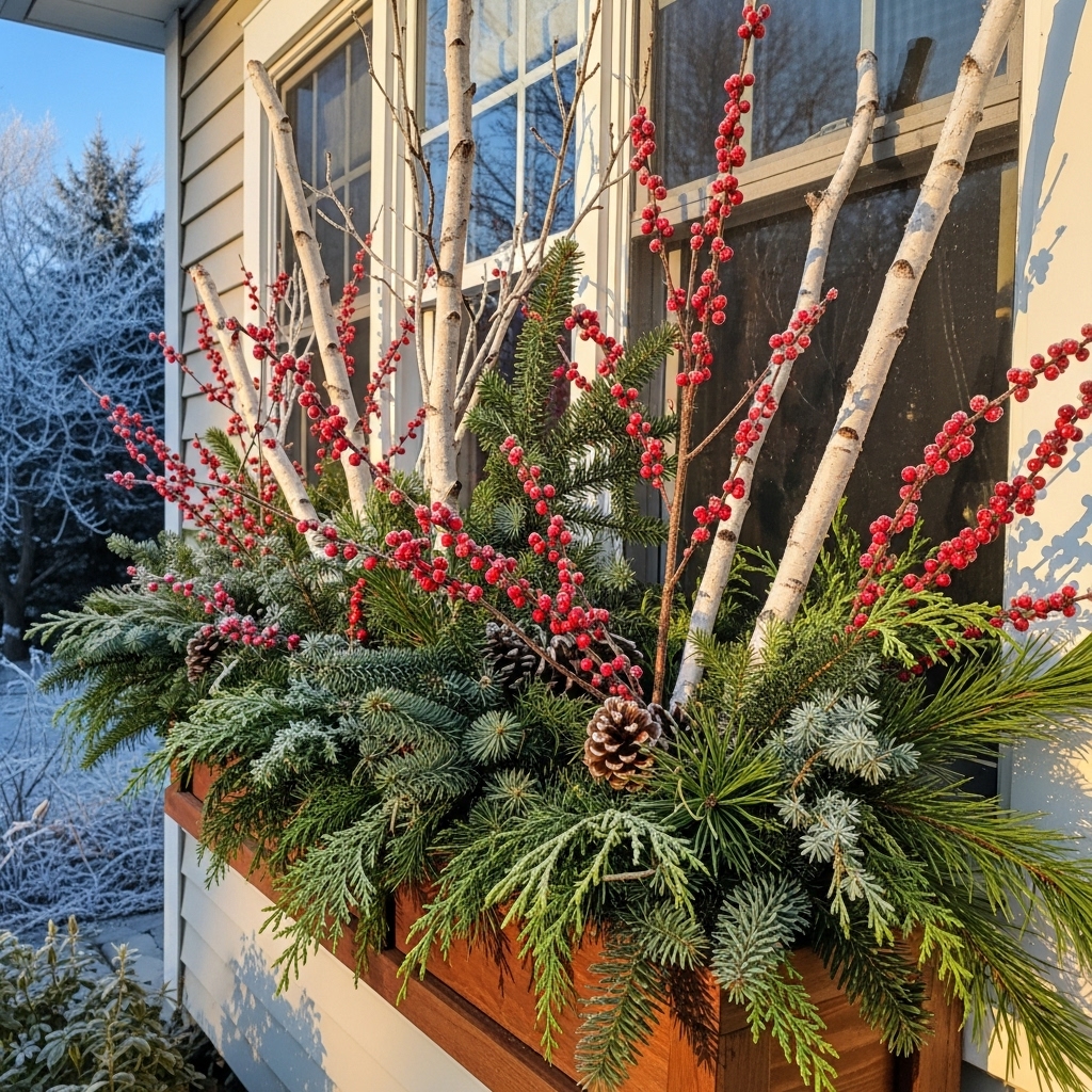 Extend your rustic Christmas decor to the outside of your home with festive window boxes. Even if you don’t have flower boxes, you can use large containers. Fill them with an abundance of evergreen cuttings. Add structure with birch branches and color with red berries or dogwood stems. This simple touch frames your windows with natural holiday cheer and makes your entire home look warm and welcoming from the street.