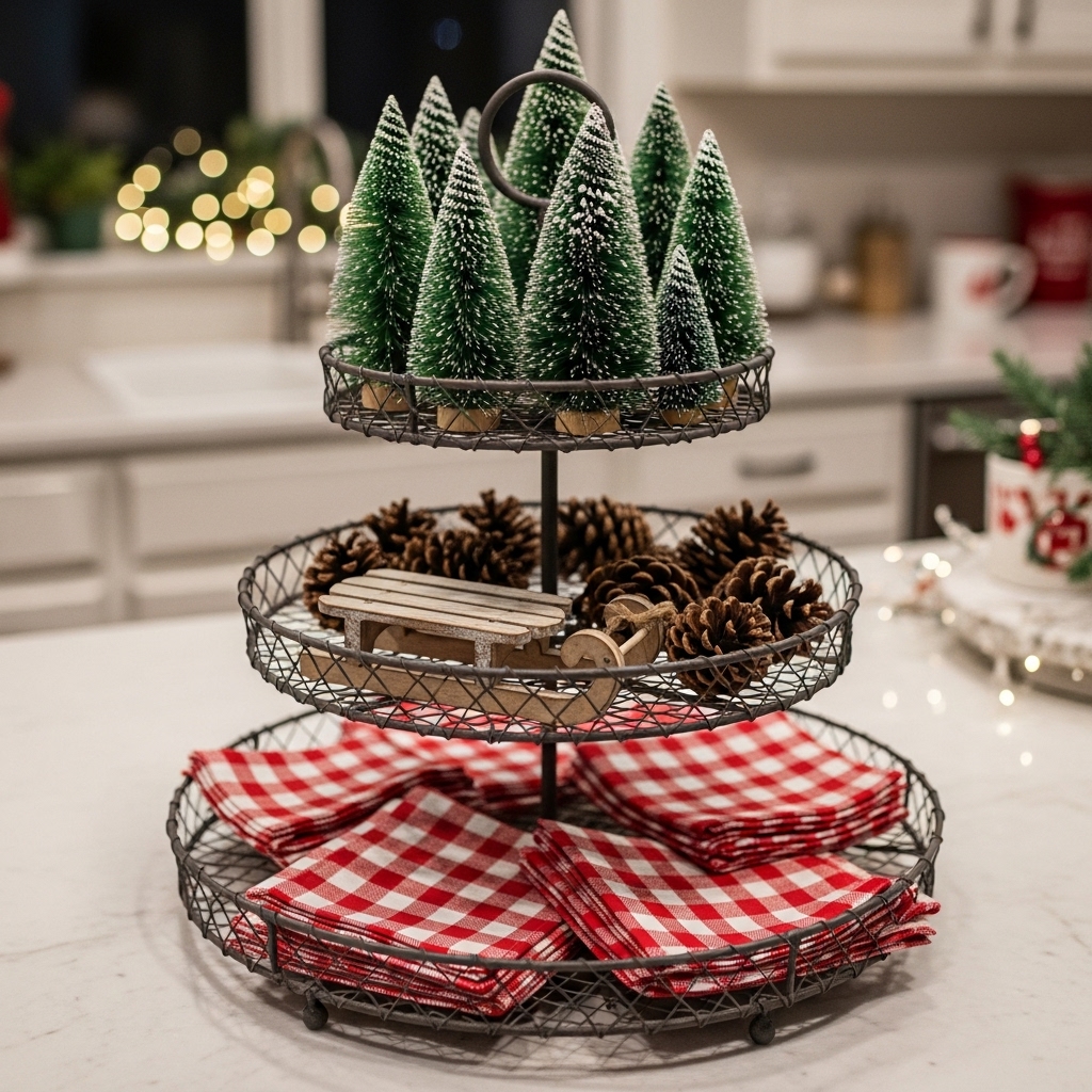 Style a tiered tray with miniature rustic charm. Tiered trays are perfect for creating a layered, festive vignette in a small space. Fill them with tiny rustic Christmas decor items like mini pinecones, bottlebrush trees, and small wooden ornaments. Tuck in a festive tea towel or a tiny candle. This idea allows you to tell a small, decorative story that is packed with detail and charm, perfect for a kitchen or entryway table.