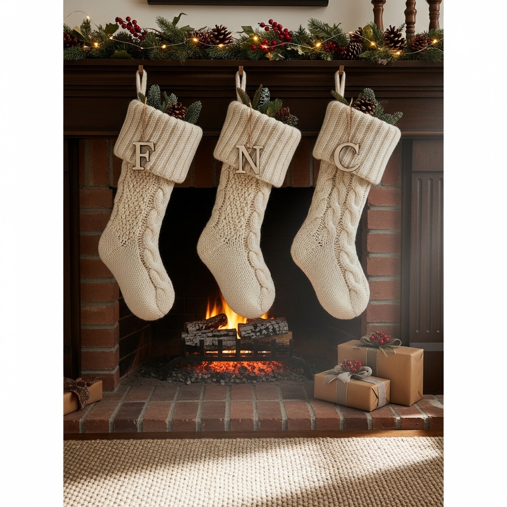 Ditch the velvety stockings for something more textured. Chunky, cable-knit wool stockings are the epitome of rustic coziness. Their neutral color and natural texture complement any rustic Christmas decor theme. Personalize them with wooden initials or tags. Hang them with care on your mantel or from a wall-mounted branch. They promise to be filled with simple, heartfelt gifts and add a layer of tactile warmth to your holiday decor.