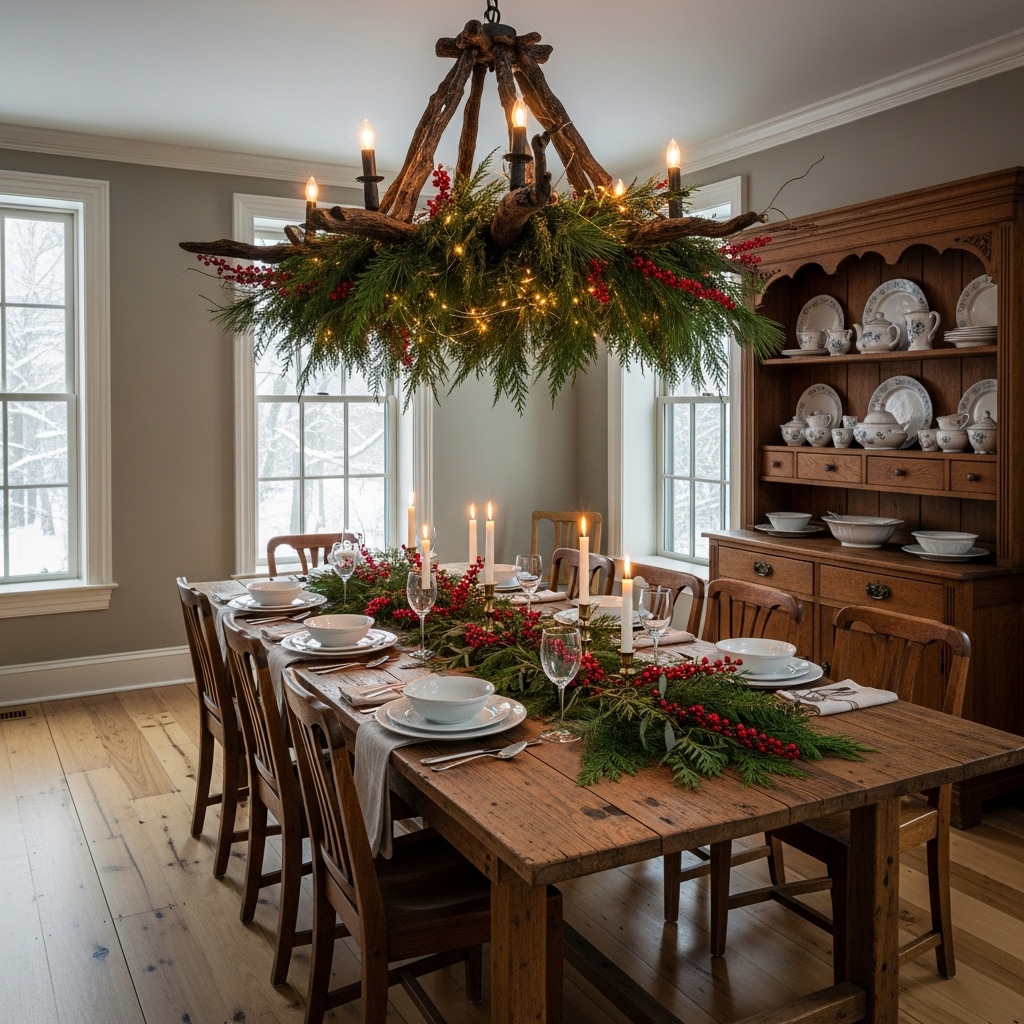 Elevate your dining experience by decorating your light fixture. Drape a fresh, flexible garland around the arms of a chandelier or light fixture. Weave in a string of fairy lights for a soft, ambient glow. This unexpected touch brings the beauty of rustic Christmas decor eye-level, creating a magical atmosphere for holiday dinners. It’s a simple way to make a big statement and make every meal feel special.