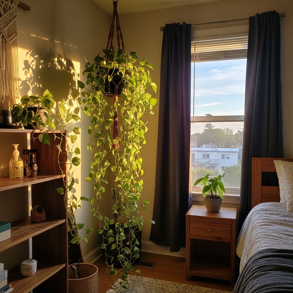 Add softness and movement with trailing Pothos. It’s one of the most forgiving bedroom plants, thriving in various light conditions. Let its vines trail from a high shelf or a hanger. It tells you when it’s thirsty by drooping slightly—a perfect reminder for busy plant parents. This plant brings a beautiful, flowing energy that softens room corners and shelves.