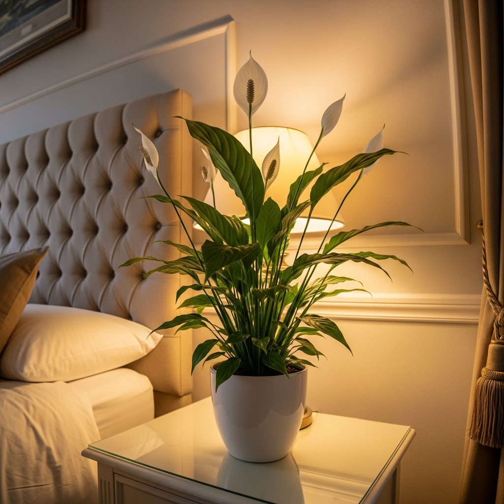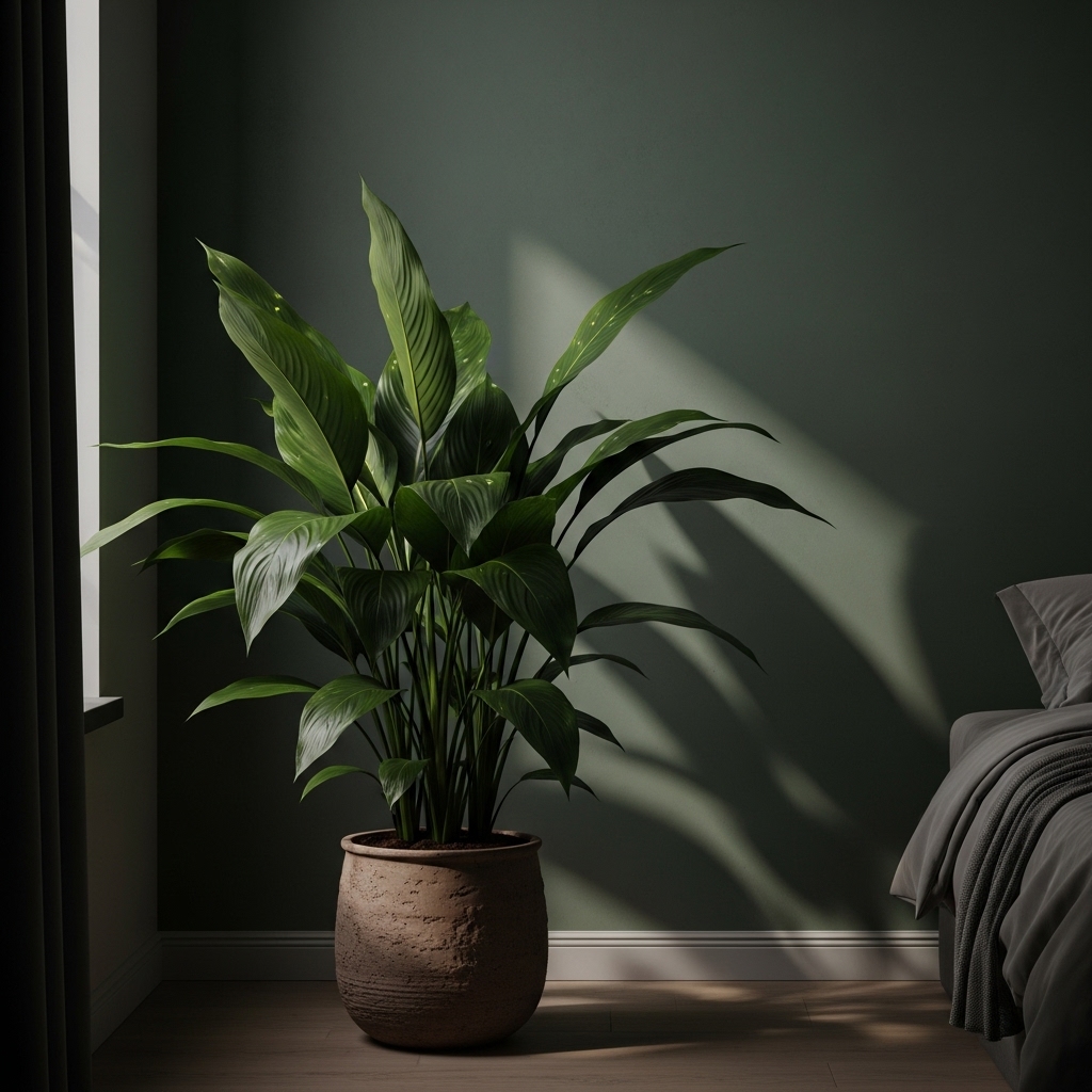 The Peace Lily offers beautiful foliage and stunning white blooms. It’s a dramatic communicator among bedroom plants, wilting noticeably when it needs water and perking back up quickly after a drink. It thrives in medium, indirect light and helps filter harmful toxins from the air. This plant adds a classic touch of elegance and a powerful purifying presence to your bedside.