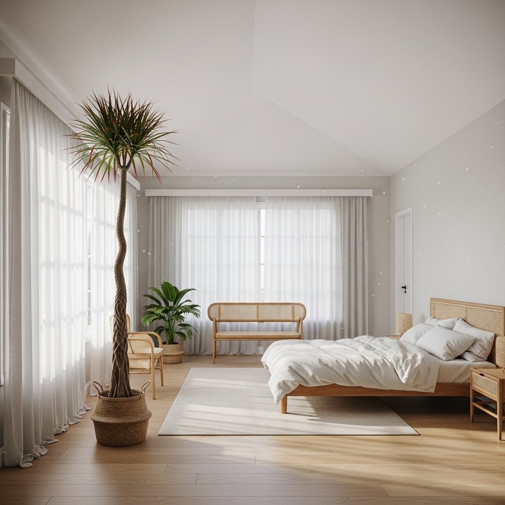 Add a tree-like presence with the Dracaena Marginata. Its slender, cane-like stems and spiky leaves bring a sculptural, architectural form to your bedroom. It’s very drought-tolerant and prefers bright, indirect light. This plant is an excellent air purifier and makes a bold statement, perfect for filling an empty corner and adding a touch of modern drama to your space.