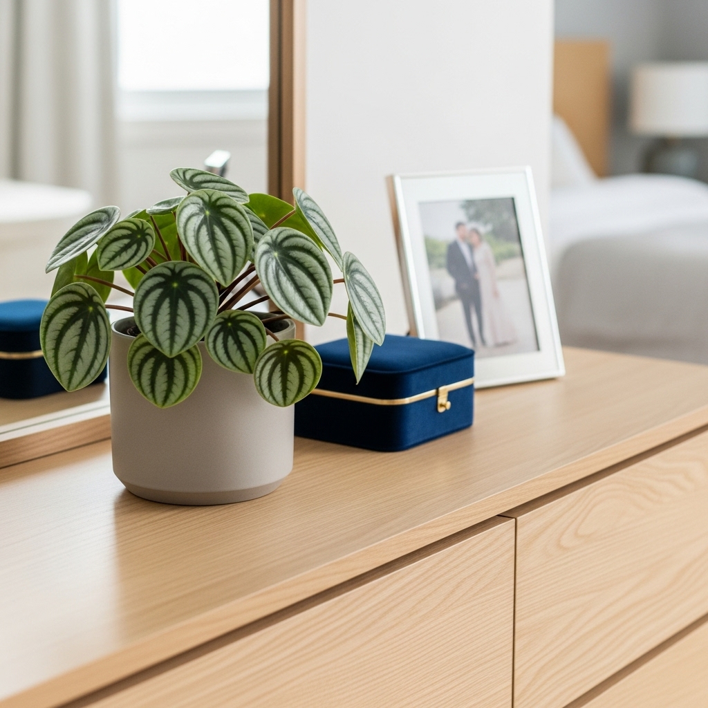Peperomias come in a huge variety of beautiful, textured leaves. The ‘Watermelon’ variety is a favorite. They are small, compact, and very easy to care for, preferring medium light and watering only when dry. These charming bedroom plants are perfect for adding detail and pattern to a nightstand or dresser without taking up too much space.
