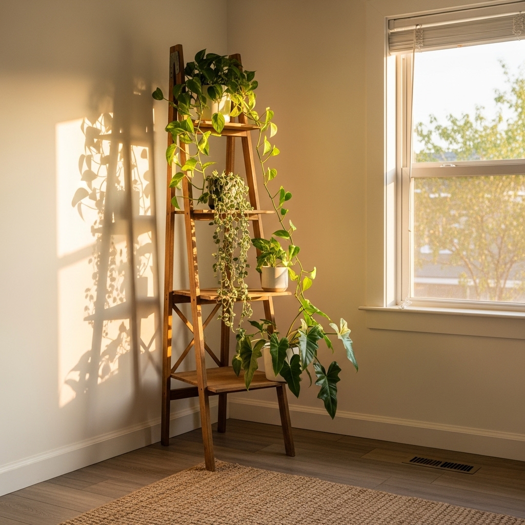 A leaning ladder shelf offers a flexible and charming plant shelf solution. Its angled design adds dynamic energy to a room. You can easily adjust the placement of plants to create a cascading green waterfall effect. This is perfect for renters, as it requires no mounting. Style it in a sunny corner to give your trailing plants the spotlight they deserve, creating a beautiful, living sculpture.