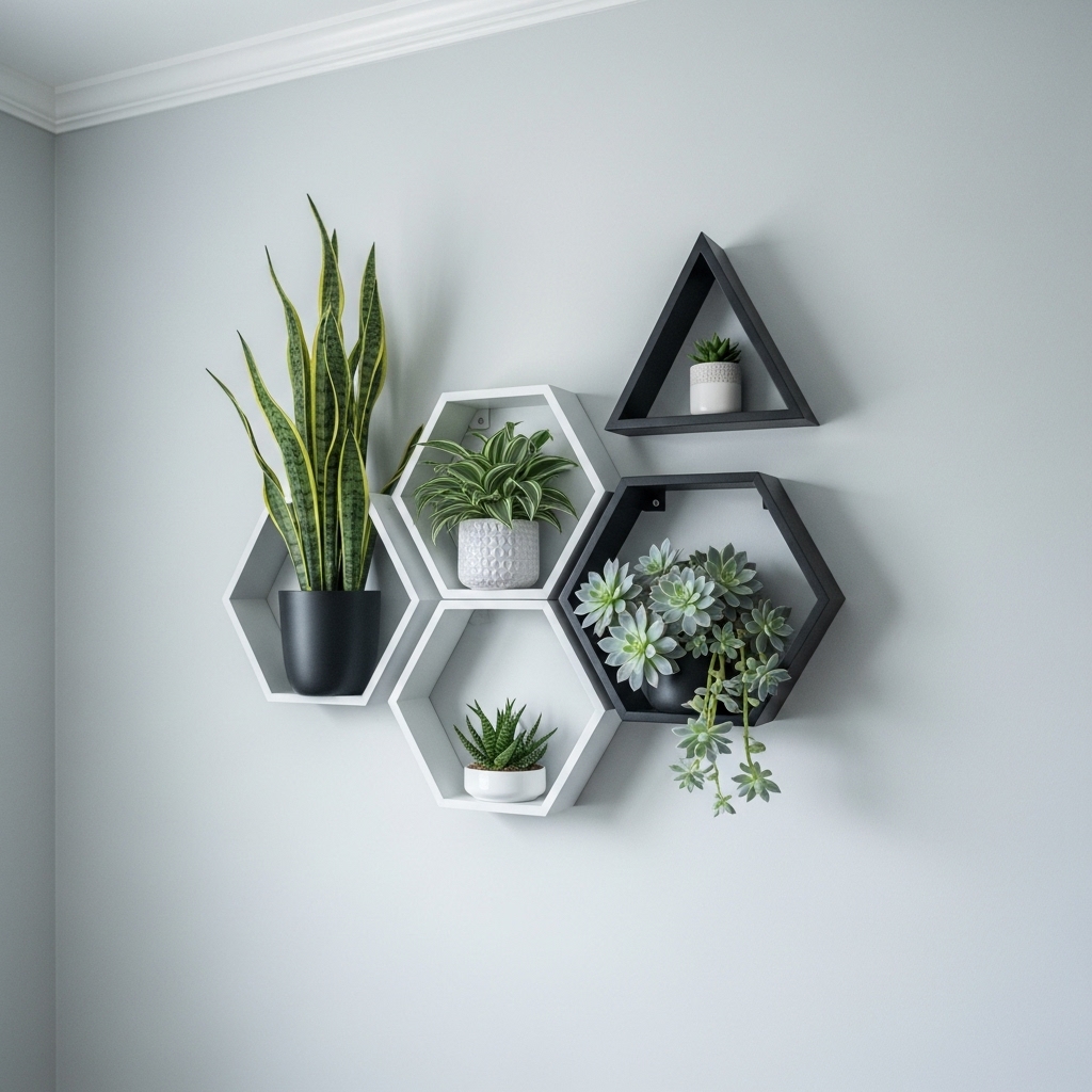 Embrace contemporary design with geometric wall shelves. This plant shelf setup acts as a piece of art itself. The unique shapes create visual interest on any blank wall. It’s ideal for displaying a curated collection of small to medium plants with structural forms. Mix and match shelf sizes to build your own custom pattern. This idea proves that a plant shelf can be a bold, stylistic statement in a modern home.