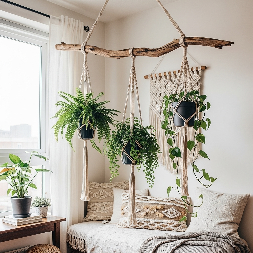 Not all shelves are solid! Create a floating plant shelf effect with a multi-tiered macrame display. This is the ultimate bohemian solution for adding greenery without taking up floor space. The varying heights add drama and allow each plant to receive ample light. It’s perfect for creating a dedicated cozy corner. Ensure your ceiling hook is secure, and enjoy watching your plants sway gently in this beautiful, airy display.