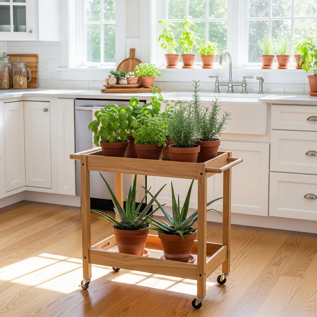 A rolling cart is the most functional plant shelf you’ll ever own. Its mobility allows you to chase the sunlight throughout the day, ensuring your sun-loving herbs and plants stay happy. It’s a perfect kitchen plant shelf for keeping fresh flavors within arm’s reach. When you need to clean or rearrange, you can simply roll your entire mini-garden out of the way. It’s stylish, smart, and adaptable.