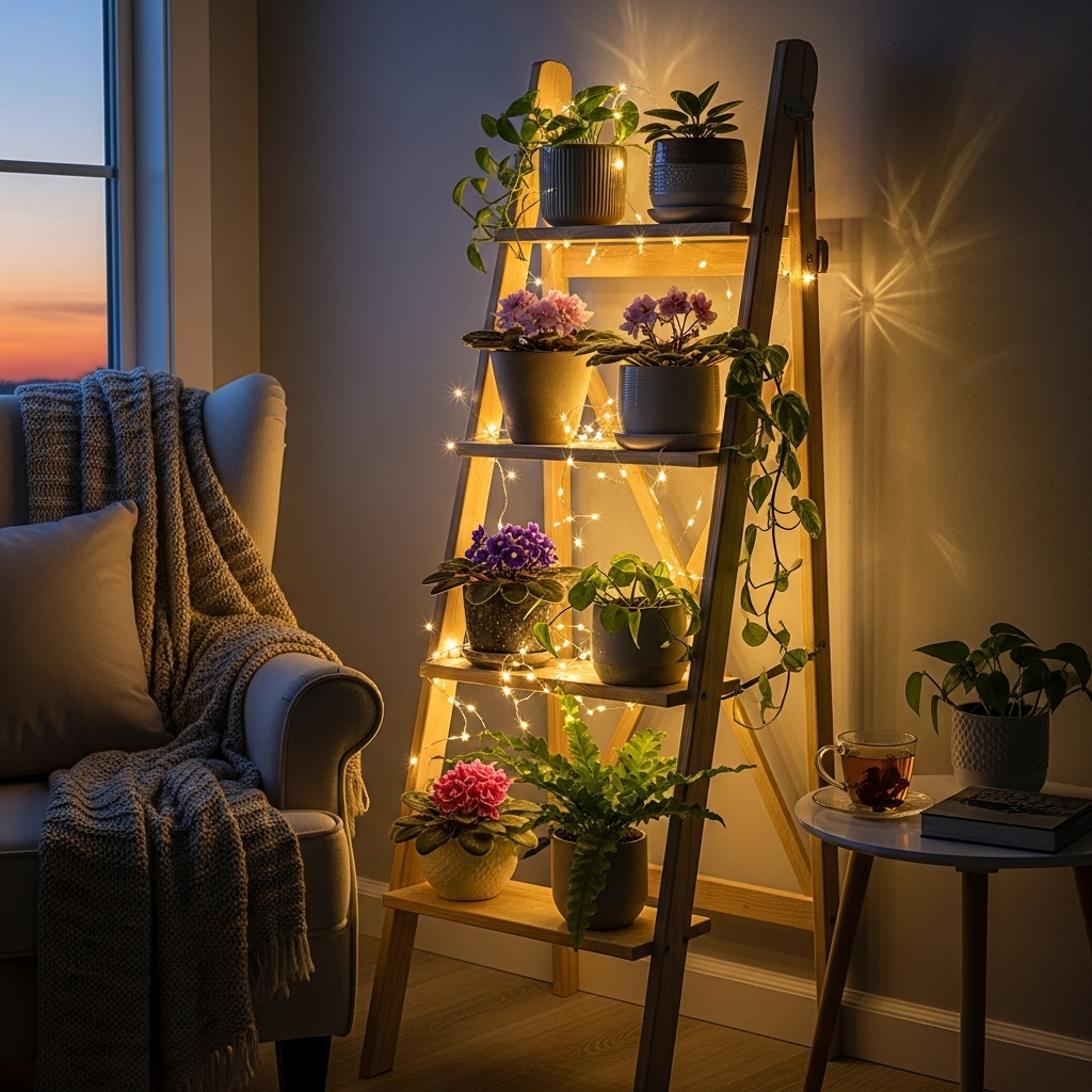 Transform a basic ladder shelf into a magical evening display with fairy lights. This plant shelf idea adds a layer of cozy ambiance to your bedroom or living room. The lights highlight the beautiful shapes of your plants and create a soothing atmosphere. It’s a simple, affordable way to make your plant shelf a source of light and tranquility after the sun goes down.