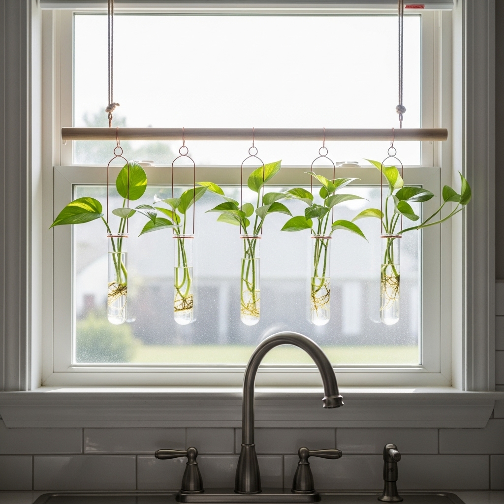 Celebrate new growth with a hanging test tube plant shelf. This is a brilliant and beautiful way to propagate your plant cuttings. The clear glass and visible roots add a fascinating, modern element. It functions as a stunning plant shelf that is both decorative and functional. Place it in a sunny window and watch your new plants grow from the very beginning.