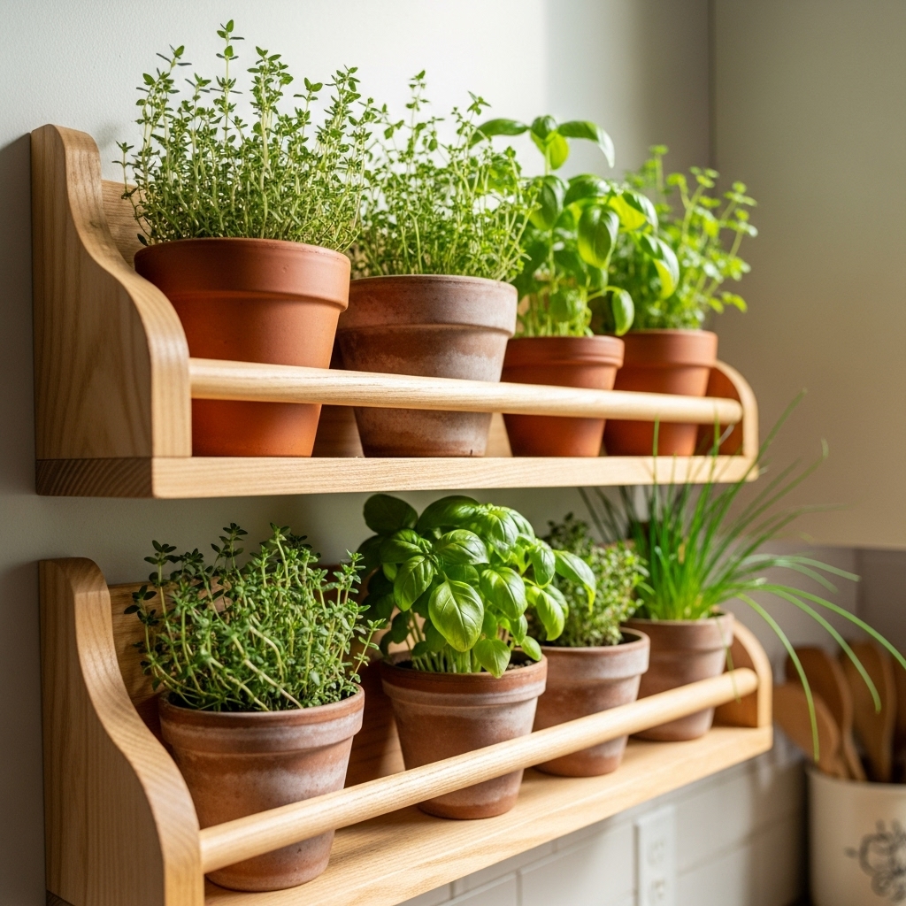 Repurpose tiered spice racks into the most adorable plant shelf for your kitchen herbs. This is a space-saving solution that keeps your fresh flavors within easy reach while cooking. The tiers ensure each small pot gets enough light. This clever plant shelf idea is perfect for small kitchens and adds a touch of green to your culinary workspace.
