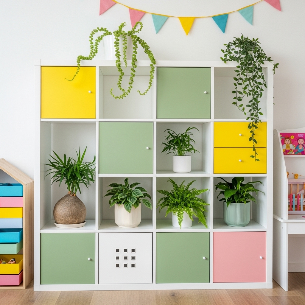 Make a bold, happy statement with a color-blocked cube plant shelf. A simple Kallax-type unit becomes a custom art piece when you paint the back panels. This is a fantastic plant shelf for a family space, adding a burst of color and life. The cubes are perfect for containing and displaying a diverse collection of plants in a organized, yet fun way.