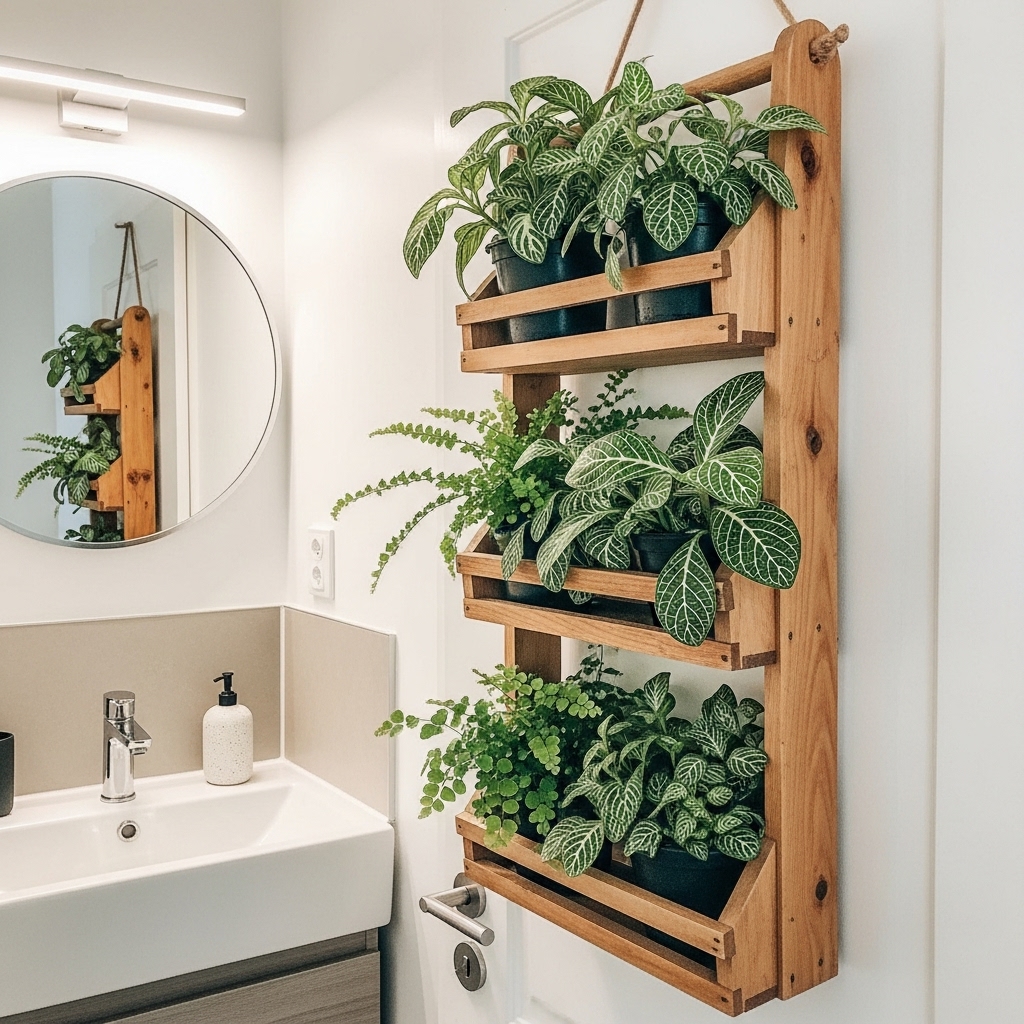 No floor or wall space? No problem! An over-the-door caddy makes a brilliant, space-saving plant shelf for a small bathroom. The tiers are perfect for small pots that thrive in humidity. This clever hack gives you a vertical plant shelf without any drilling or damage. It’s the perfect solution for adding a touch of green to even the smallest of spaces.